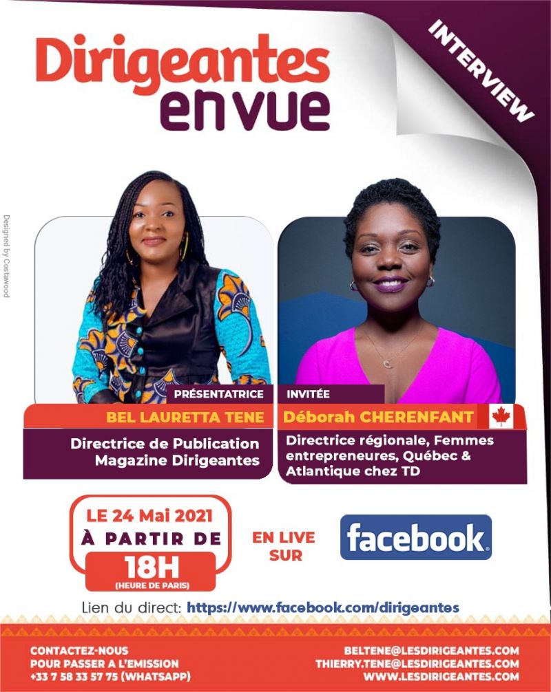 Déborah CHERENFANT, Directrice régionale, Femmes entrepreneures, Québec & Atlantique chez TD, Présidente et Porte-Parole de la Jeune Chambre de commerce de Montréal (JCCM) sera ce Lundi 24 Mai à partir de 18h (heure de Paris), l’invitée de Bel Lauretta TENE, Patronne du magazine Dirigeantes, leadership au féminin www.lesdirigeantes.com